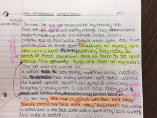 In dialogue journals, students wrote entires around the Book-Head-Heart protocol from “Disruptive Thinking” by Kylene Beers and Robert Prost. I noticed that my students struggled knowing the difference between connections made by “the head” and “the heart.” Anything not directly attributed to a text connection gave them some trouble. They could point to a piece of text. They could tell me that it mattered. Yet, explaining why it mattered proved difficult. Furthermore, when we discussed how text connections could be complemented by personal connections, they did not quite follow my line of thinking.- Students selected a novel, a poem, or a song to write an extended response to literature.