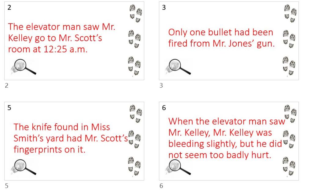 Students are given groups, clues, scratch paper, and twenty-five minutes. They have everything they need to figure out who murdered Mr. Kelley.
