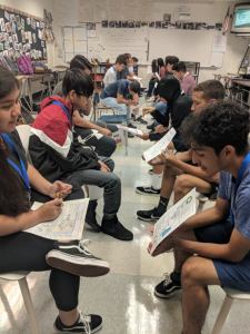 Then, at the end of our second week of school, when students would normally have spent a class period bubbling in scantrons, they instead sat in a long line of parallel chairs and “speed dated” their books. With one-pagers in hand, they each took turns selling their books for two minutes before rotating seats and starting over with a new partner. The room burst into life with discussion and genuine enthusiasm for the books and projects.