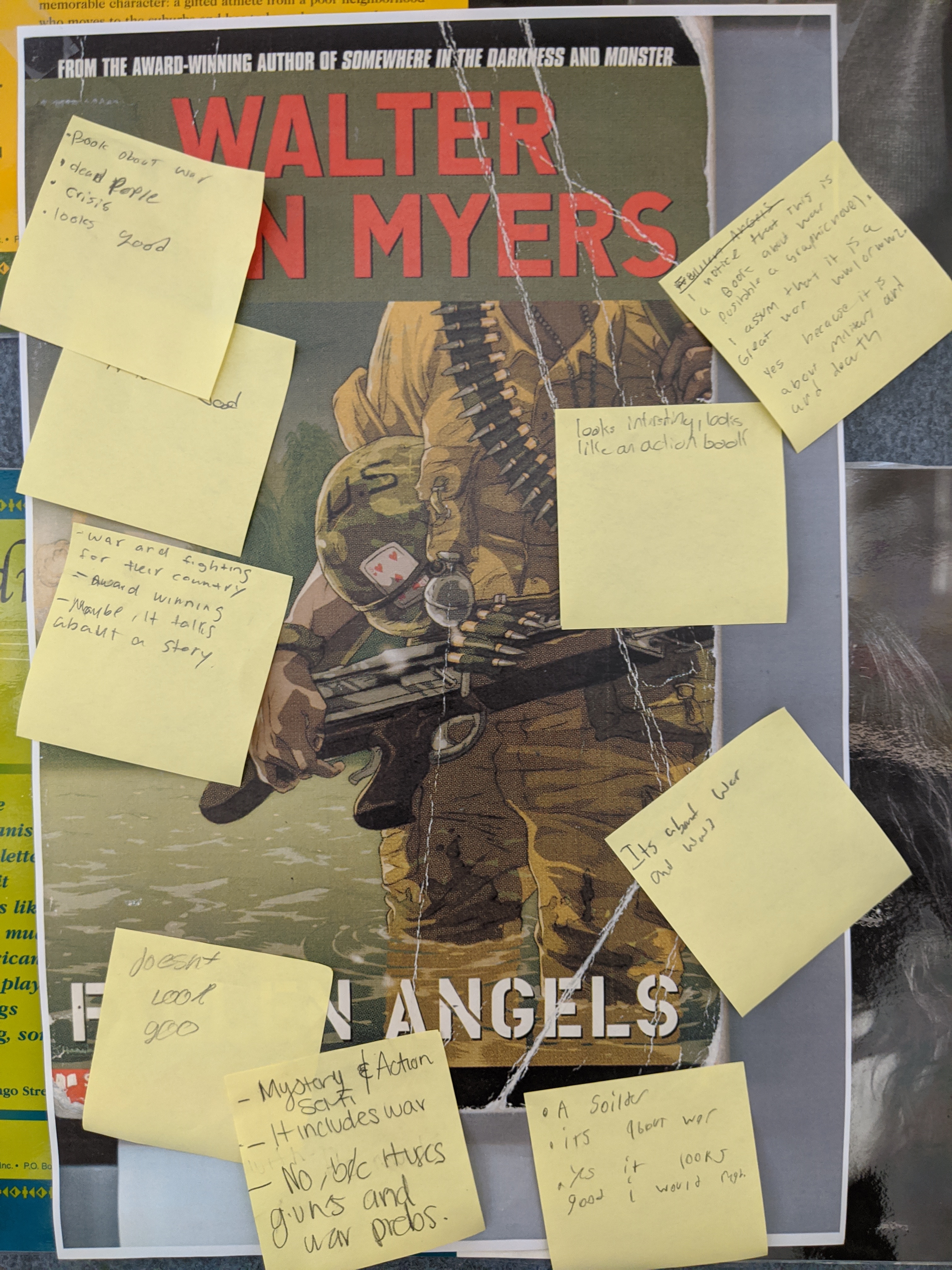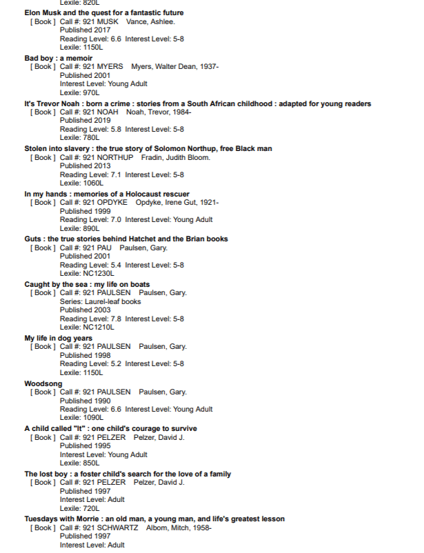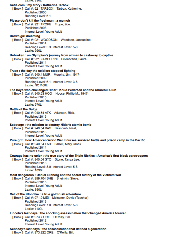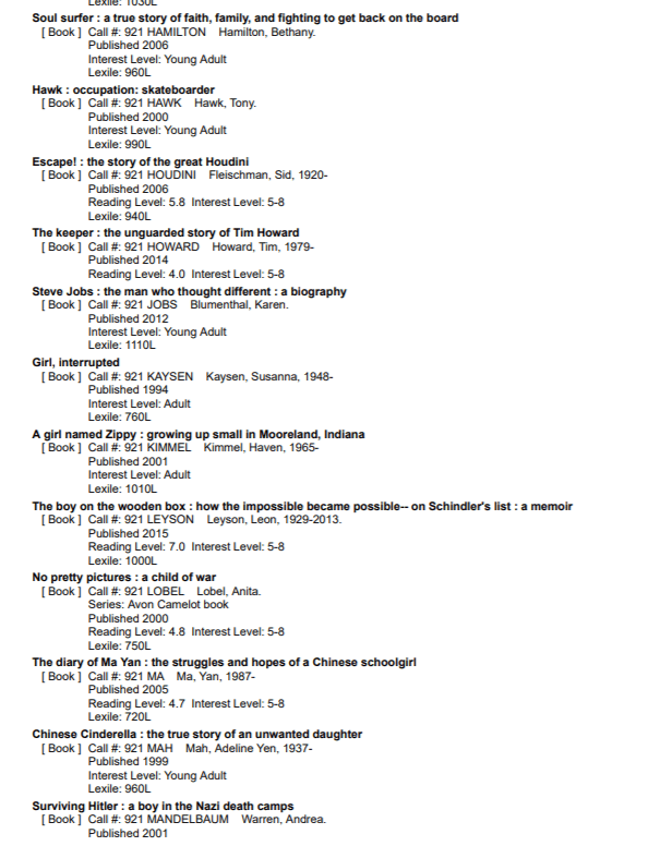 Students’ nonfiction independent reading book selections revealed a wide range of interests: a variety of historical time periods, true adventures, biographies, autobiographies, self-help books, and current social issues. While most students chose different books, one group of eighth graders decided to read Undefeated and two other groups read I Will Always Write Back as book clubs. Ultimately, choice created engaged students and supported differentiation. The majority of students selected narrative nonfiction texts.