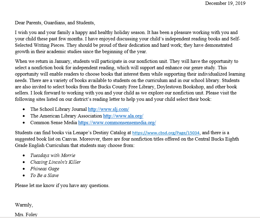 In the end, I offered these titles but also invited students to choose any nonfiction or narrative nonfiction book. I enlisted the help of our librarian to collect books that met the requirements in our school library, and students browsed at our community library, local bookstores, and Amazon. Sending home a letter to parents and guardians helped students obtain books outside of school.