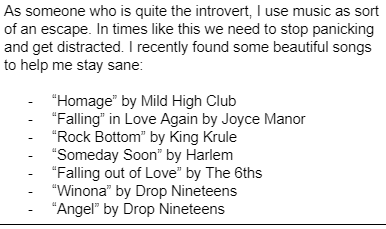 Another wrote about how she’s been coping and shared her song suggestions with the class: