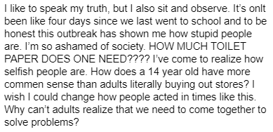 As Kelly explains, “The last thing I want to do with my home-bound students is to load them down with brain-numbing packet work. So this lesson plan was designed to honor student choice, student agency, student voice.” One of my favorite things about Kelly’s plan is it invites students to spend time journaling about this developing situation everyday. He not only acknowledges that we are living through history in the making, but he creates space for students to spend time reflecting on and cataloging their histories as they unfold. I am now on day three of engaging in this journal writing approach with my students and have been astounded by some of the observations they are making and sharing (note: my students are invited to share their thoughts with each other and/or me, but not required). One student reflected: