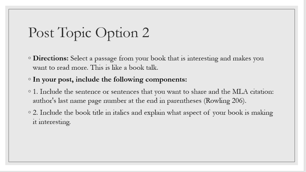 PowerPoint has always worked to share text excerpts and mini-lesson notes with my students. I like how easy it is to add and move pictures, and the recording option comes in handy. With distance learning, PowerPoint has helped me compile and share materials. As per our district’s directions, all lessons should review and enrich student knowledge. This approach supports Penny Kittle and Kelly Gallagher’s “laps” and “spiral back” practice in 180 Days since we are returning to and extending previously learned concepts.