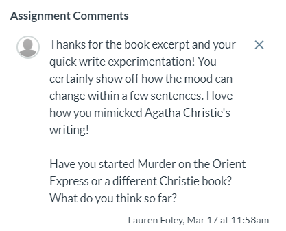 Reading and writing conferences are vital to our classroom. Being at home, I am missing chatting with my students. To help solve this issue, I turned to Canvas; however, any learning management system, online sharing platform, chat feature, voice recording app, email, etc. will work to digitally conference with your students. On Tuesday and Wednesday, I invited my eighth graders to submit items between the hours of 7:30 am to 2:00 pm for optional feedback and conferencing. Some topics that we discussed were reactions to their independent reading books, their quick writes, answers to or questions about the mini-lessons, and book recommendations.