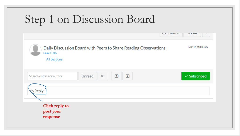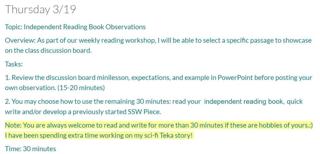 Friday always focuses on SSW with style, craft, and grammar mini-lessons plus workshop time for students to write, conference, and collaborate. Because of distance learning’s limited time, I took out the minilesson. However, if students wanted to read for 10 minutes, they were welcomed to do so. For student conversations, I created discussion board groups based on their table groups in class. They could share their work with their classmates and collaborate through Canvas. At the end of their 30 minutes, students were invited to complete two tasks: submit your weekly quick writing (or SSW) to the assignment for feedback and share your current independent reading book title and page number.