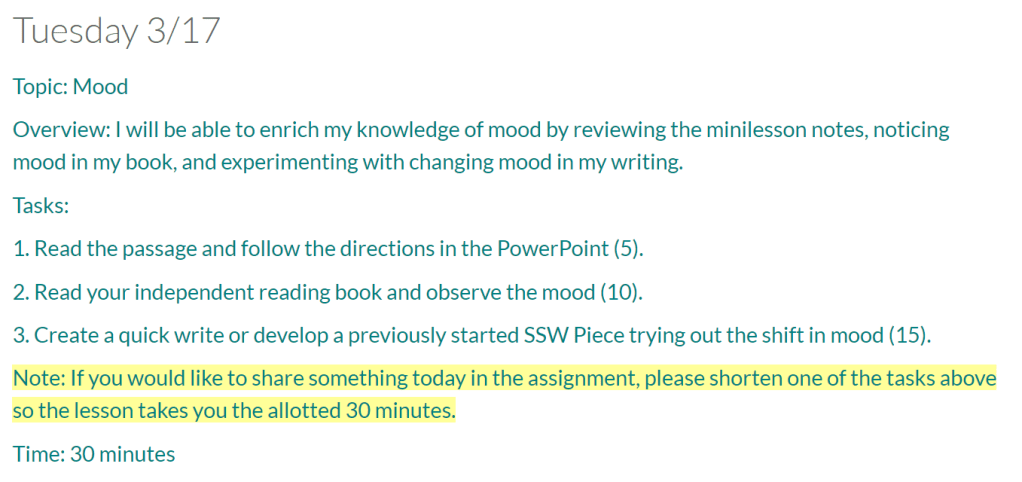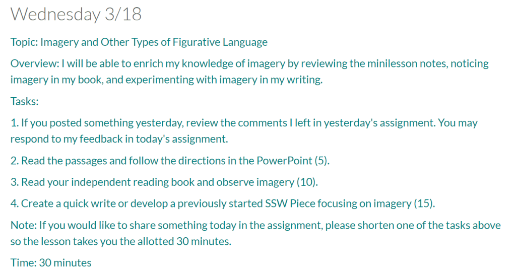 I am also trying to keep our weekly schedule similar even though students should be working on English for only 30 minutes each day. On Monday, Tuesday, and Wednesday, I allotted time for reading, writing, mini-lessons, and quick write inspirations. Thursday is dedicated to reading workshop, providing students with additional independent reading; time to work with their books in various ways; and the opportunity to share their ideas with classmates. I wanted to digitally replicate our workshop feel as best as I could.