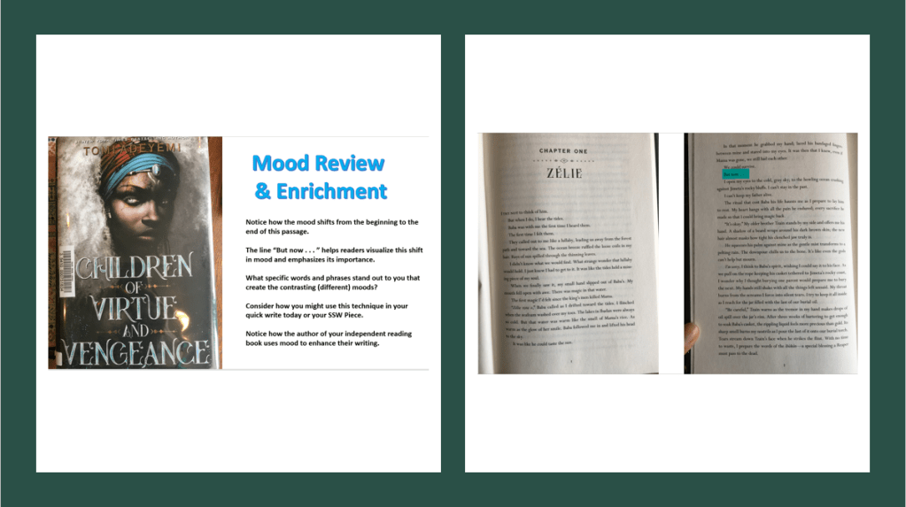 In our Tuesday mood mini-lesson, I selected a passage from The Children of Virtue and Vengeance (you should read this series!) that illustrates a change in time and mood. For Wednesday, I selected another passage from The Children of Virtue and Vengeance that used imagery. While we analyzed mood and imagery earlier this school year, we have not done so in this capacity. Thursday’s PowerPoint reviewed discussion board expectations and directions. I offered two possible post topics and included student examples of posts and responses. See some of the mini-lesson slides below.