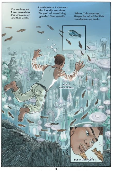 My students LOVE graphic novels – I never seem to have enough on my classroom shelves. This graphic novel, published by DC Comics and set in the DC Universe, seems to have something for everyone – love, friendship, family tension, secrets, super powers. Jake, the main character, is struggling with his evolving identity as he develops a crush on swim team captain Kenny, secretly applies for a college far from home, and grapples with a mysterious power marking his skin. The book was just published a week ago and I can’t wait until my copy is delivered! Here are the first two pages for you to sample: