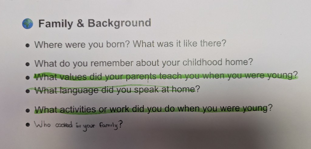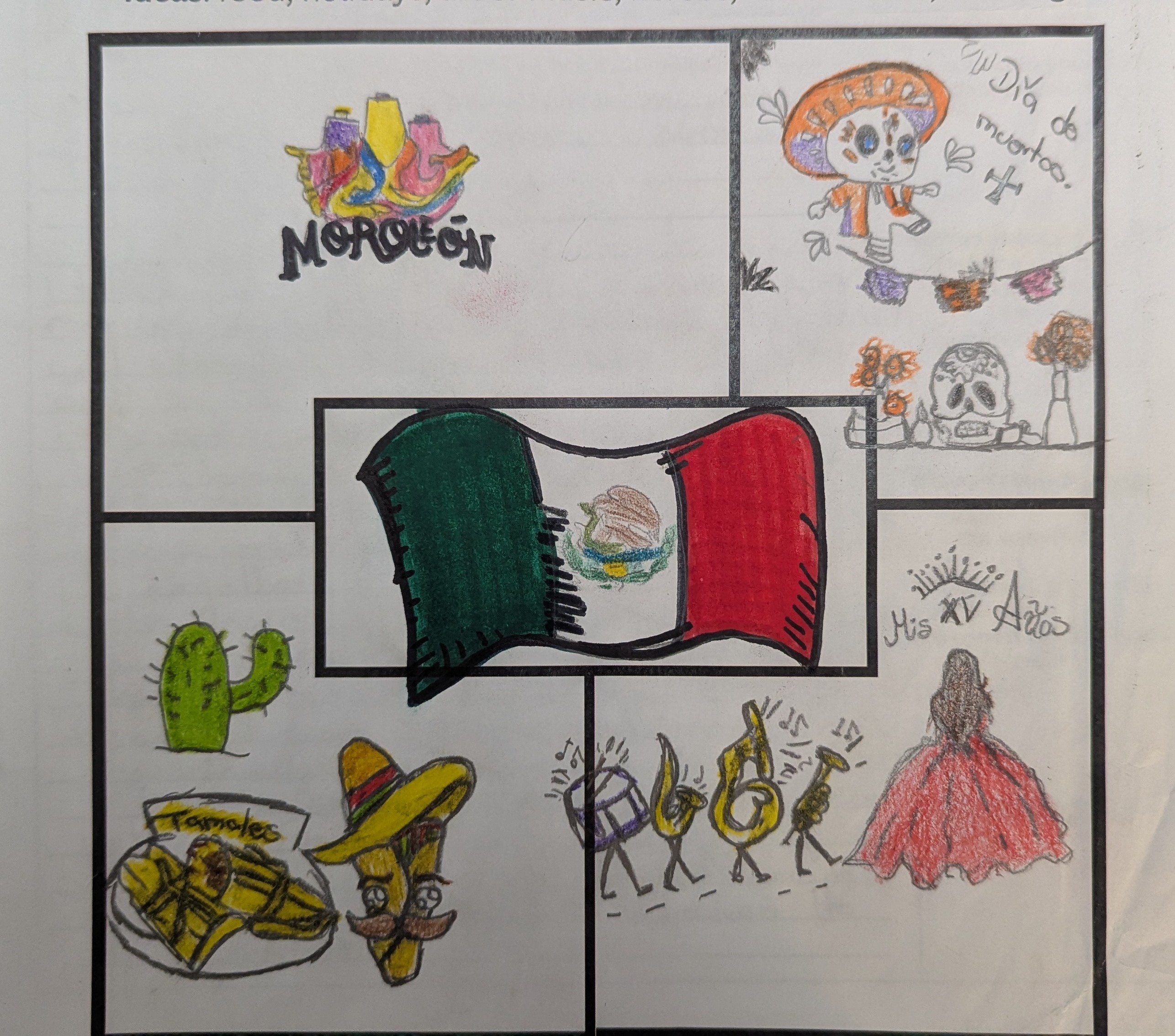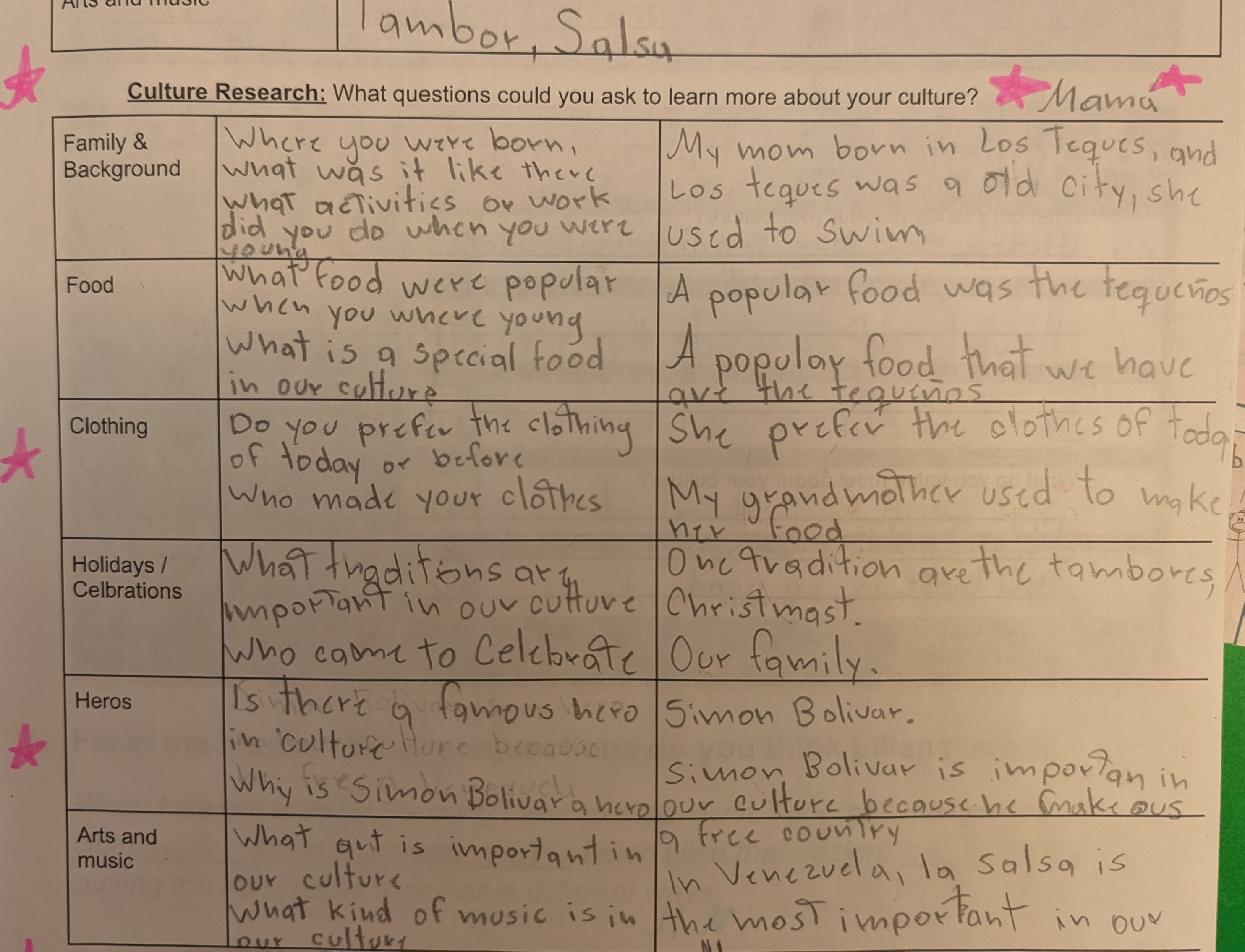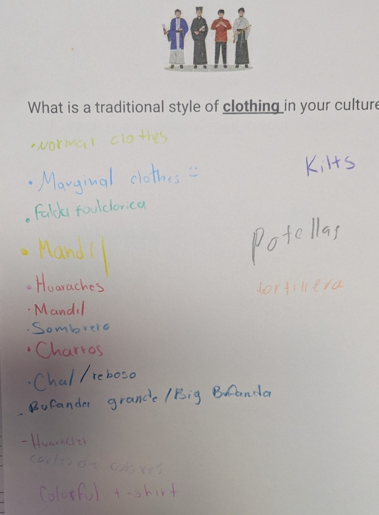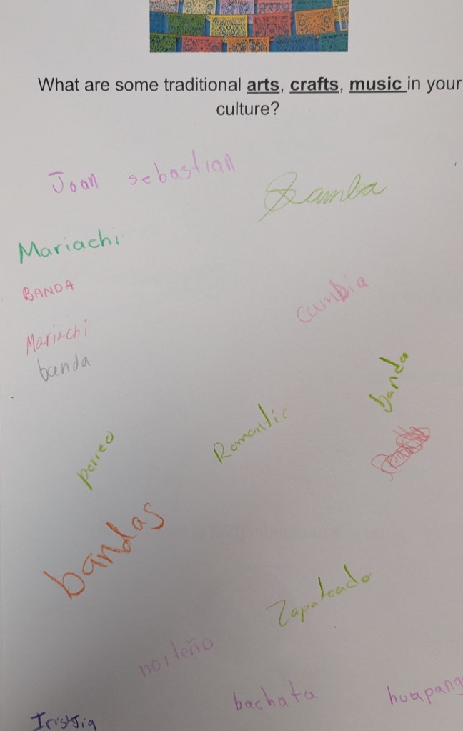 Next, we move into inquiry. Students review sample interview questions and then create and share their own. Their goal: learn more about a cultural topic that matters to them. Over the weekend, they are tasked with interviewing an elder—a parent, grandparent, aunt, or uncle.When they came back from this assignment, the room was full of stories. One student talked about discovering his uncle’s favorite song, “100 años pienso en ti” by Pedro Infante, and how that music connects to his own tastes. Another learned that her mother and grandmother made their own clothing growing up. A third noted the traditions her mom shared about her hometown in Mexico: “When I talked with my mom, I learned the traditions of ‘La Barranca Moroleon GTO’. I learned the activities that the people did, how they danced the cumbia, walked with the ‘santito’, went to eat in the houses of different people, and also the clothing that they used to wear—huipil—to special occasions like the party of July 25, ‘the misa’ when many people are together listening the ‘padrecito’.”