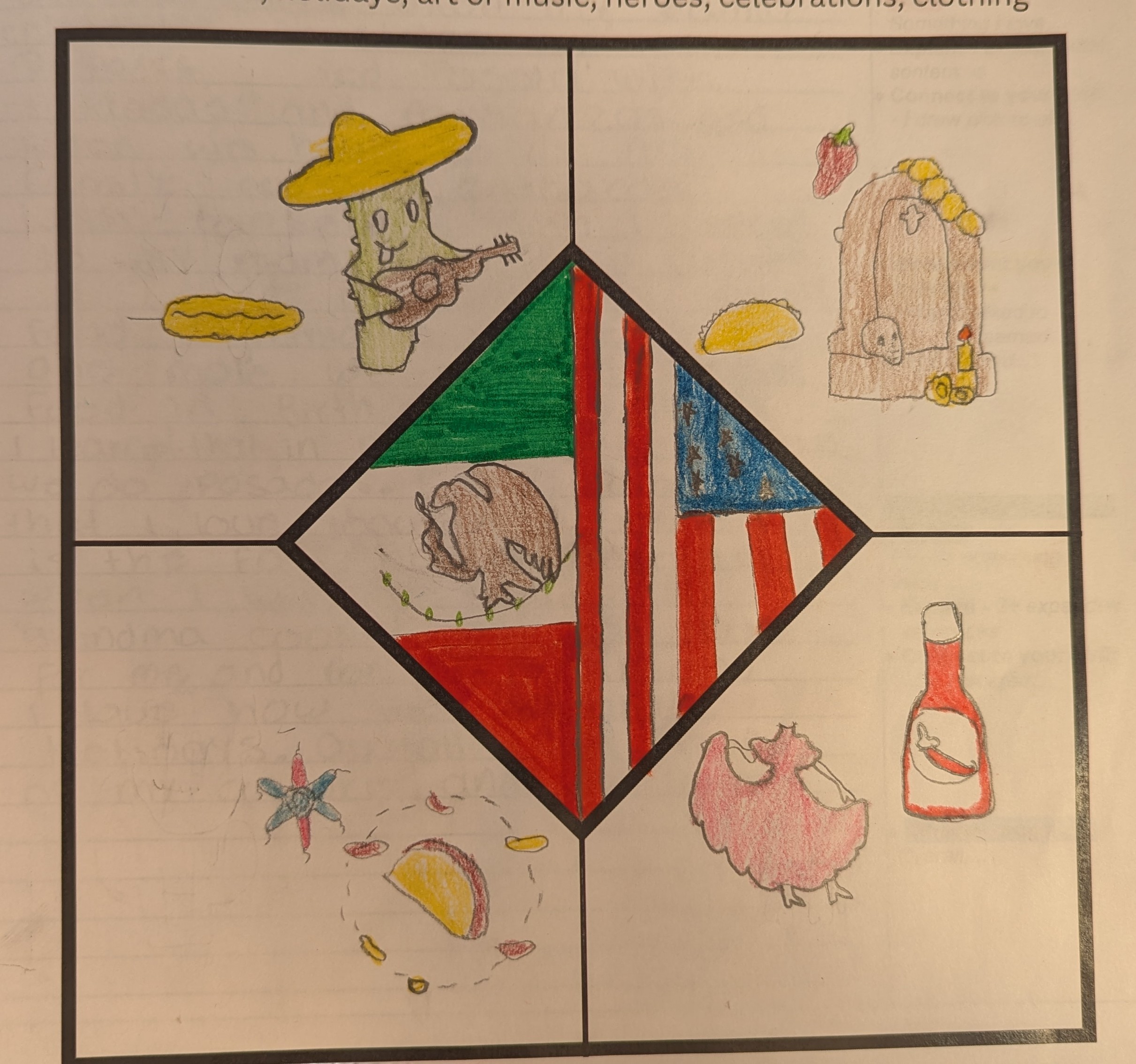 Students spend the first part of the school year reading a powerful memoir called Dreams and Nightmares: I Fled Alone to the United States When I Was 14 by Liliana Velazquez. In this book, Liliana writes about her experience leaving her home in Guatemala to find a new home and the promise of a new life in the United States. In our writing, we focus on a powerful moment where Liliana describes sewing a quilt to preserve her culture and memories of her grandmother: “I don’t want to lose my culture, and it can be a remembrance of my grandmother. I’m going to sew a quilt… I want to give my mother this quilt as a present that I have made with my own hands. I want to give her a memory of Guatemala, of my tradition.” That idea became the inspiration for the writing assignment – students are tasked with creating and writing about their own culture quilt square.
