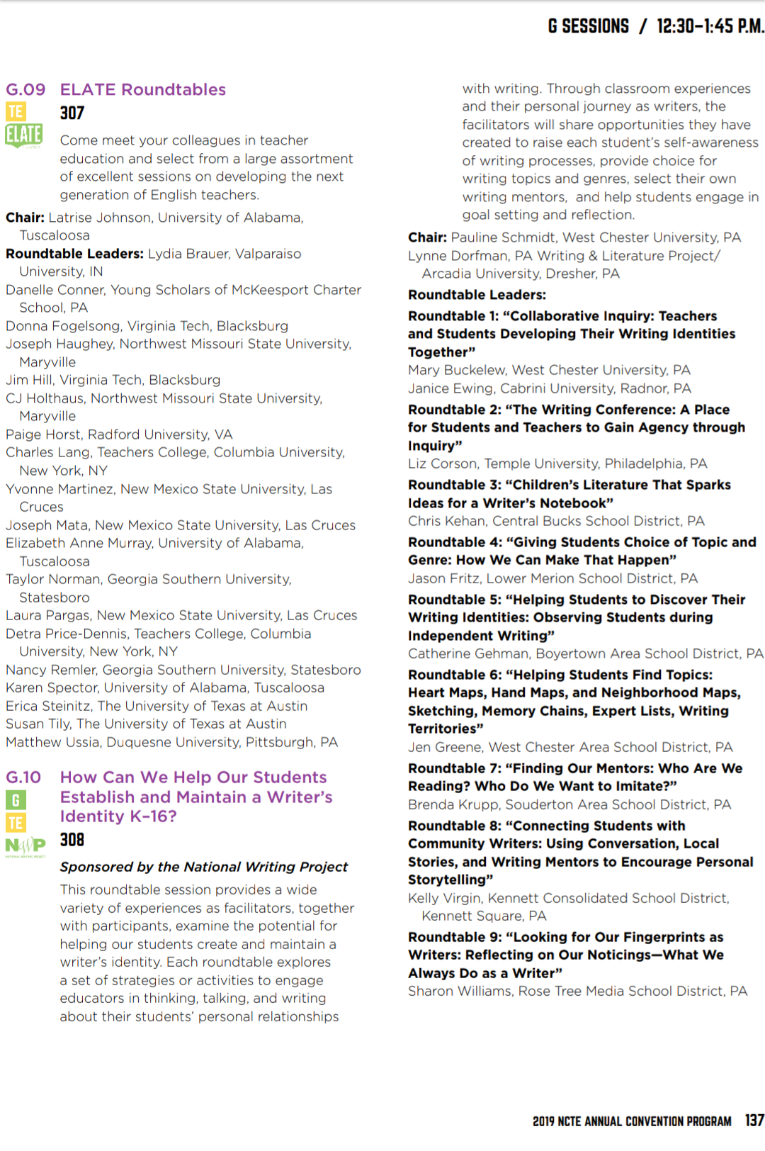 In the weeks leading up to attending NCTE for the first time, I considered each session carefully as I perused through the offerings posted in the online schedule for each day. I honestly thought that I would be attending professional development workshops that would offer me ideas on how to enhance my teaching practices in my classroom. And, while this was one of the ultimate aftereffects of attending, NCTE was so much more. For me, the conference not only offered me the benefit of useful tools that can readily be implemented into my classroom, but it also afforded me the opportunity to collaborate with peers, meet with mentors known personally and from afar, and to reflect upon inclusiveness and social justice in my own practices.